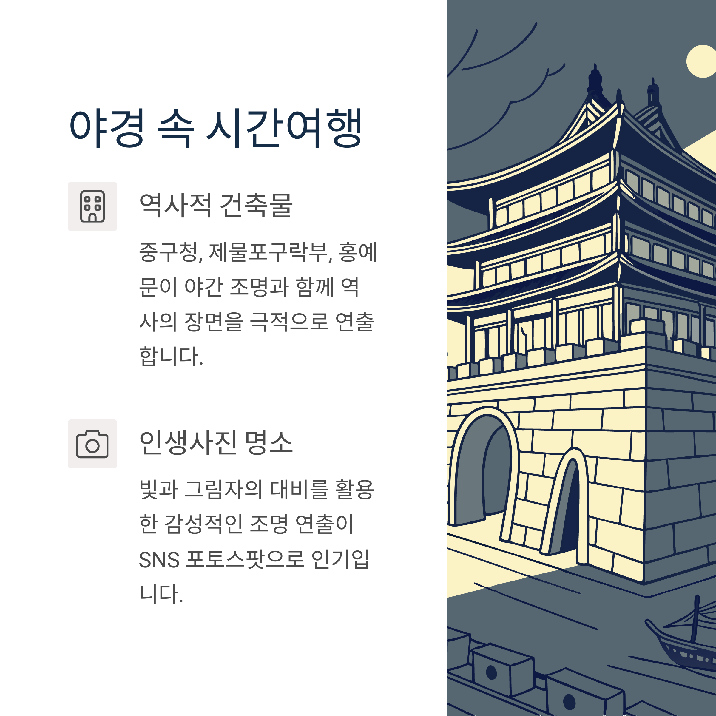 "문화재 야경 속 인생사진"을 테마로 삼은 조명 설치는 빛과 그림자의 대비를 최대한 활용해 감성적인 연출을 극대화합니다.