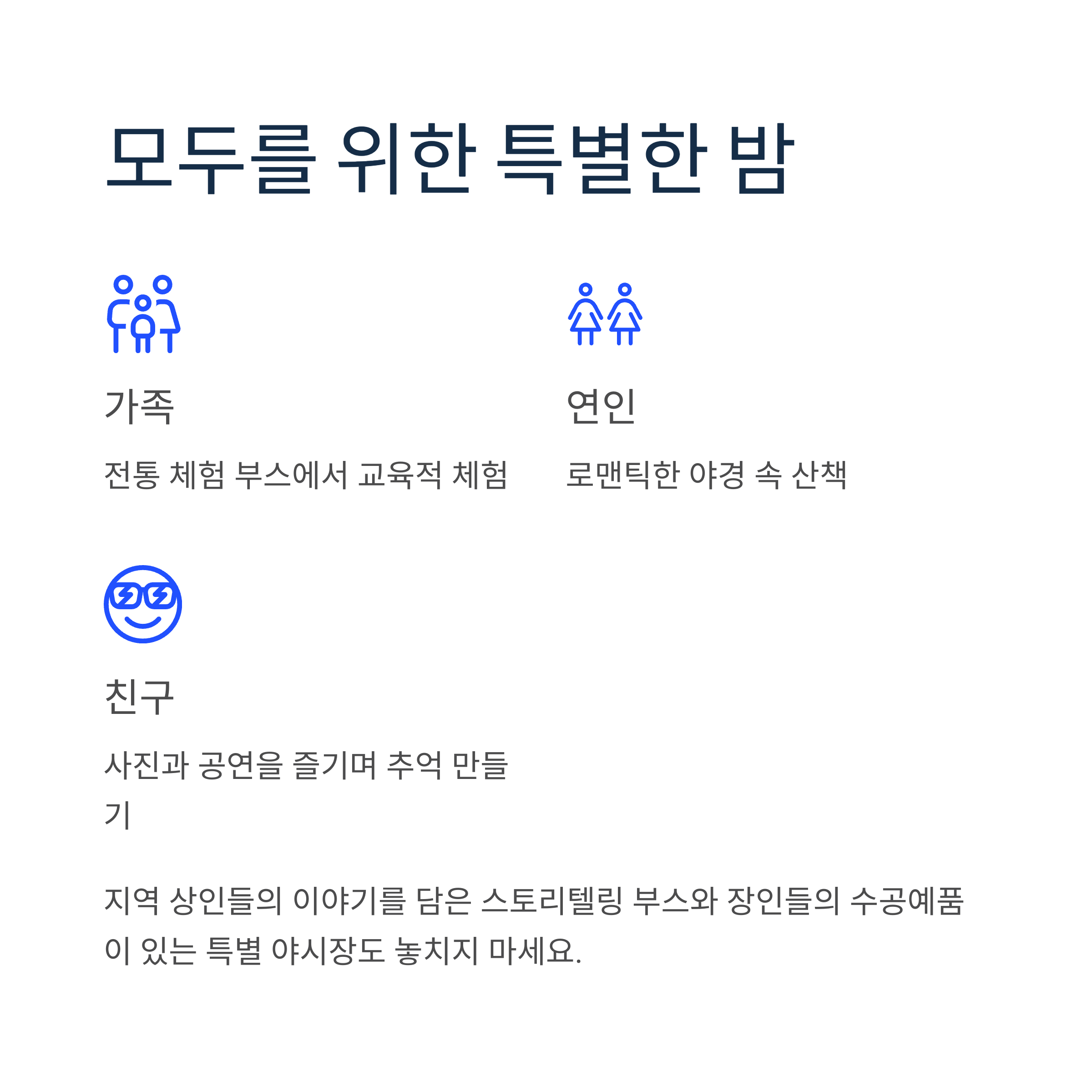 아이들과 함께 온 가족은 전통 체험 부스에서 교육적 체험을, 연인들은 로맨틱한 야경 속 산책을, 친구들은 사진과 공연을 즐기며 각자의 방식으로 추억을 만들 수 있습니다.